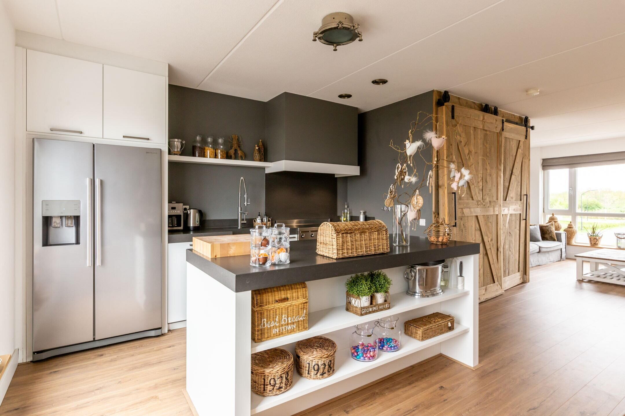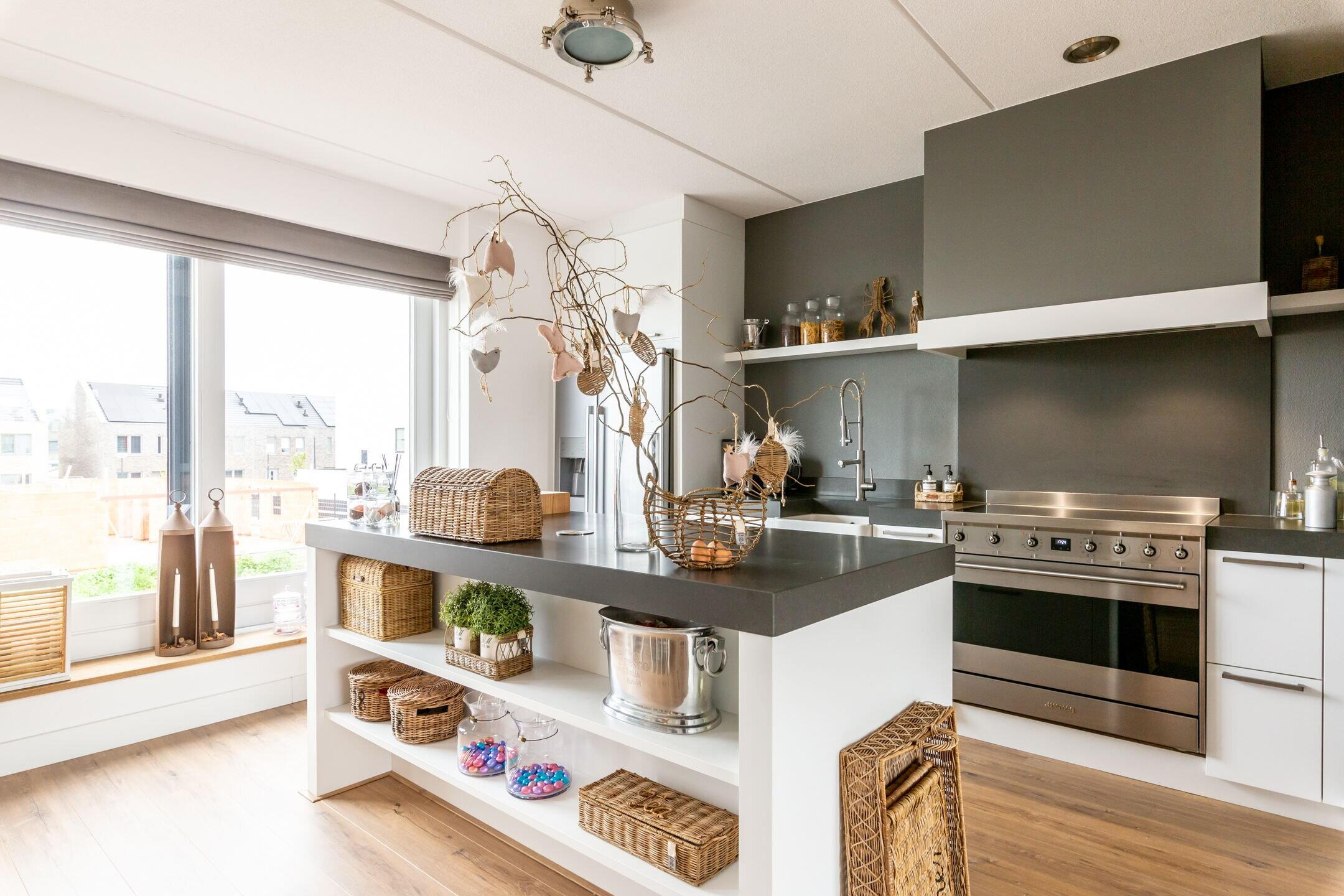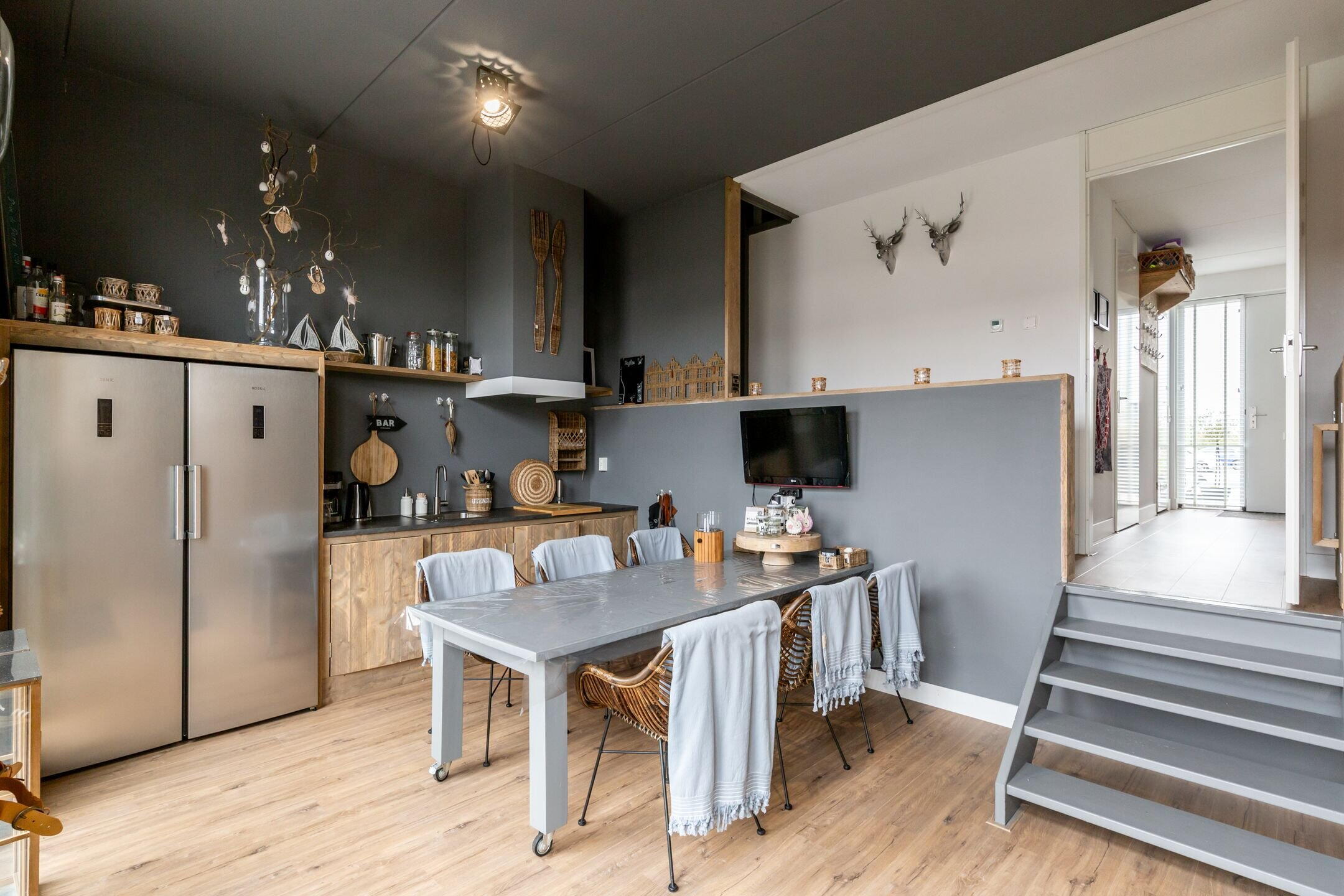 Eerste verdieping: Woonverdieping 53m² welke is opgedeeld in een woonkamer aan de voorzijde van 31m² en een royale ruimte voor de keuken van 22m², met een schuifpui (voorzien van een hor) met zicht op het water; in moderne kleurstelling uitgevoerde keuken welke is voorzien van de navolgende inbouw apparatuur: een volledig geïntegreerde vaatwasser, inductiefornuis met oven, afzuiging een natuurstenen werkblad en een vrijstaande (maar wel ingebouwde) koelkast.