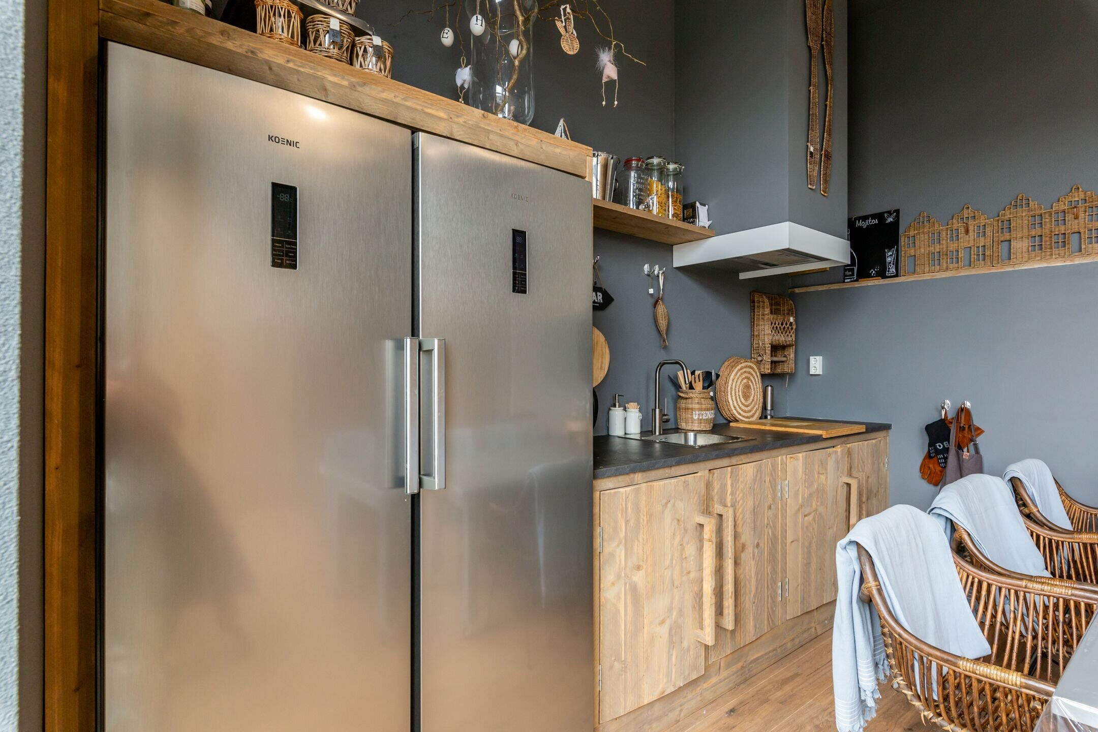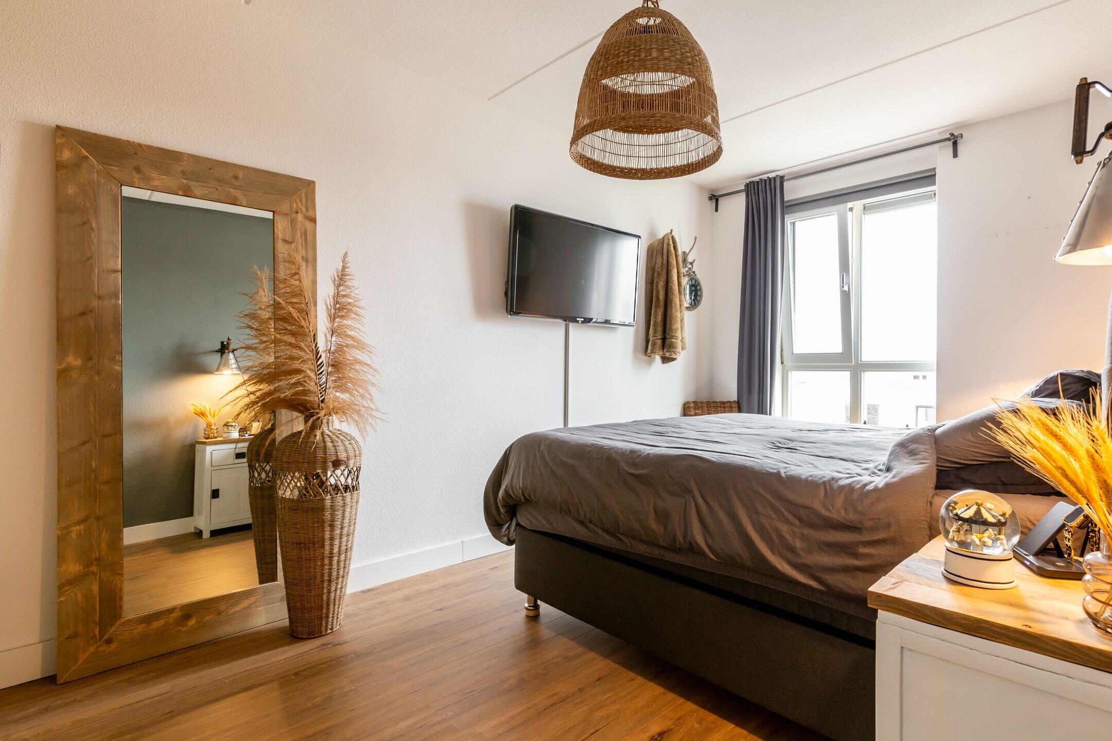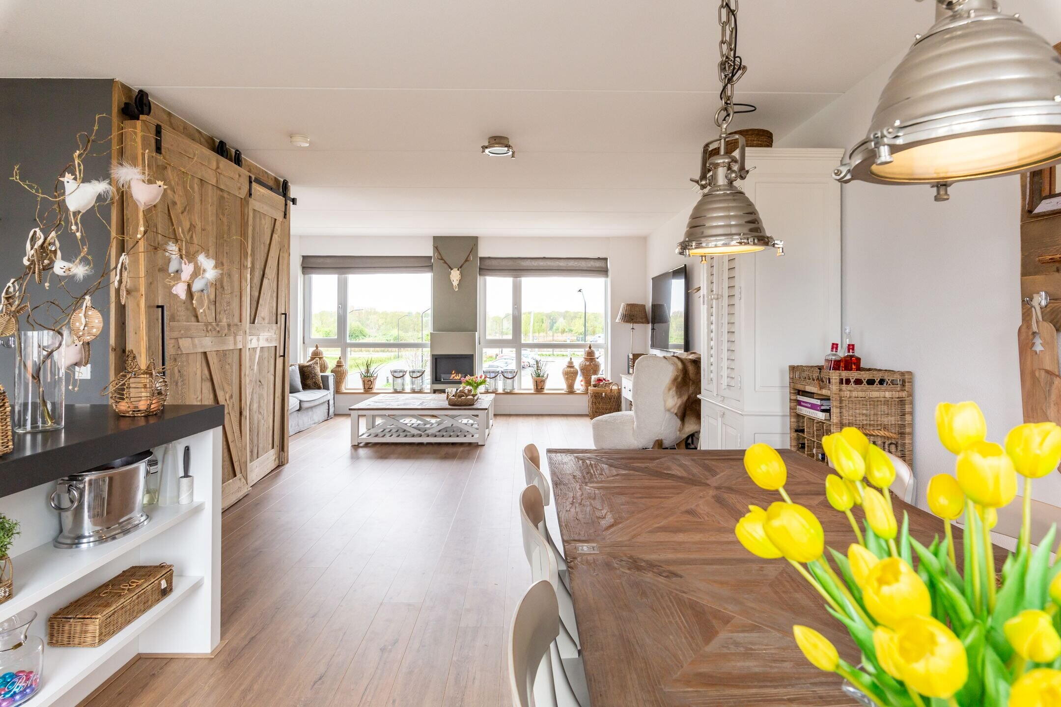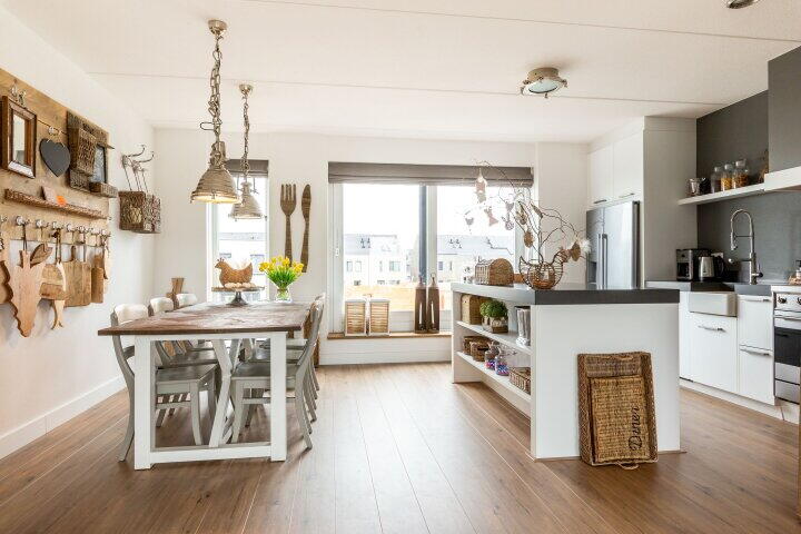 Eerste verdieping: Woonverdieping 53m² welke is opgedeeld in een woonkamer aan de voorzijde van 31m² en een royale ruimte voor de keuken van 22m², met een schuifpui (voorzien van een hor) met zicht op het water; in moderne kleurstelling uitgevoerde keuken welke is voorzien van de navolgende inbouw apparatuur: een volledig geïntegreerde vaatwasser, inductiefornuis met oven, afzuiging een natuurstenen werkblad en een vrijstaande (maar wel ingebouwde) koelkast.