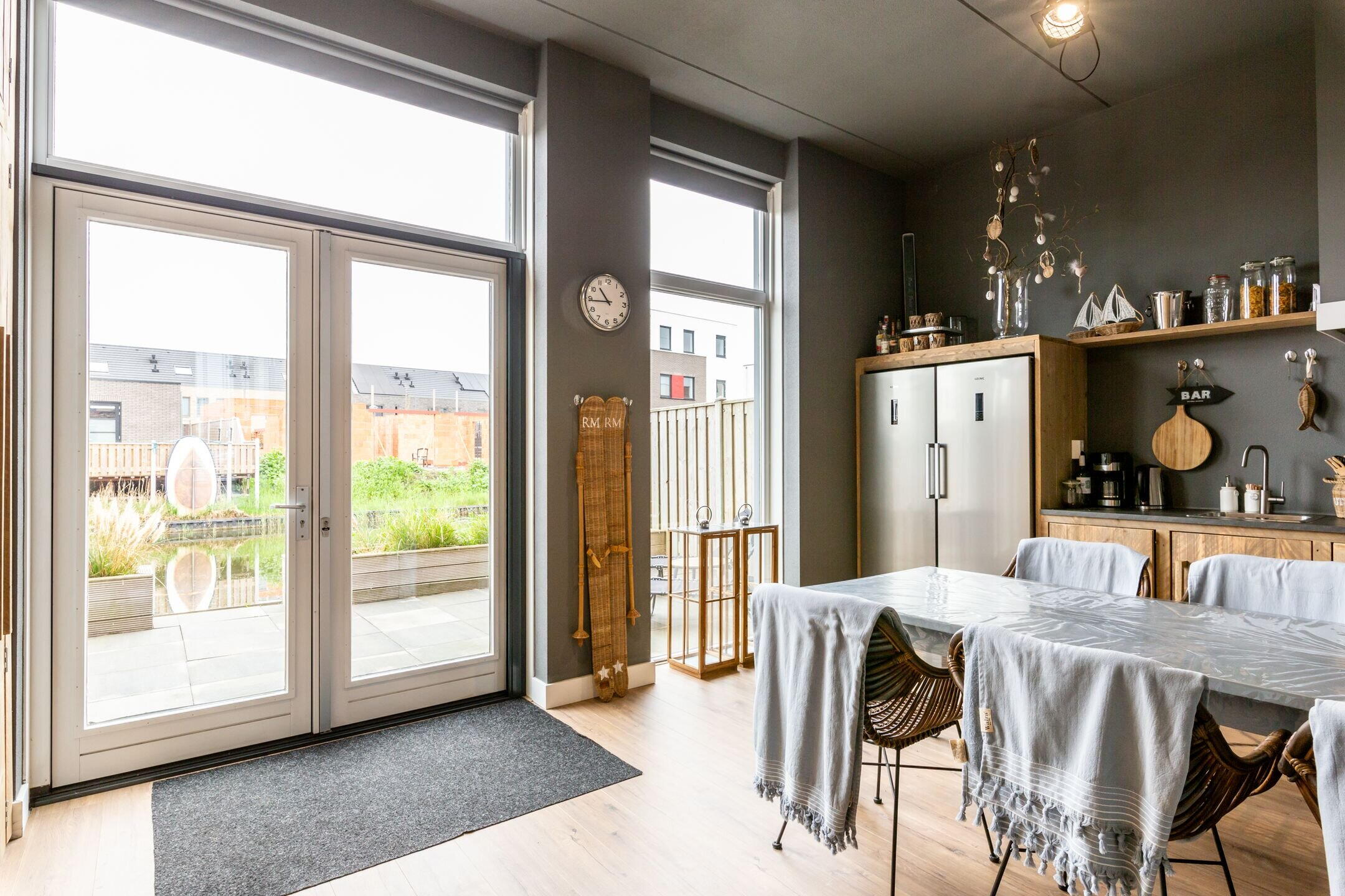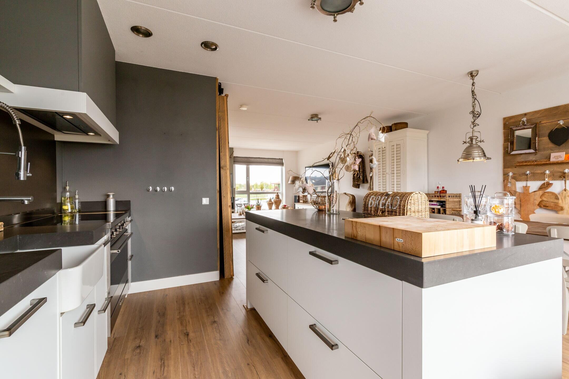 Begane grond: Entree; hal met meterkast, garderobe, toilet, doorgang naar de bijkeuken en de keuken; inpandige berging/ bijkeuken welke eveneens van buitenaf te bereiken is met witgoed aansluitingen en een bergkast voor de techniek; split-level woonkeuken van 20,9m² welke is voorzien van een werkblad zonder inbouwapparatuur en een (vaste) kastenwand; u loopt door de openslaande deuren zo het terras op dat aan het water grenst.